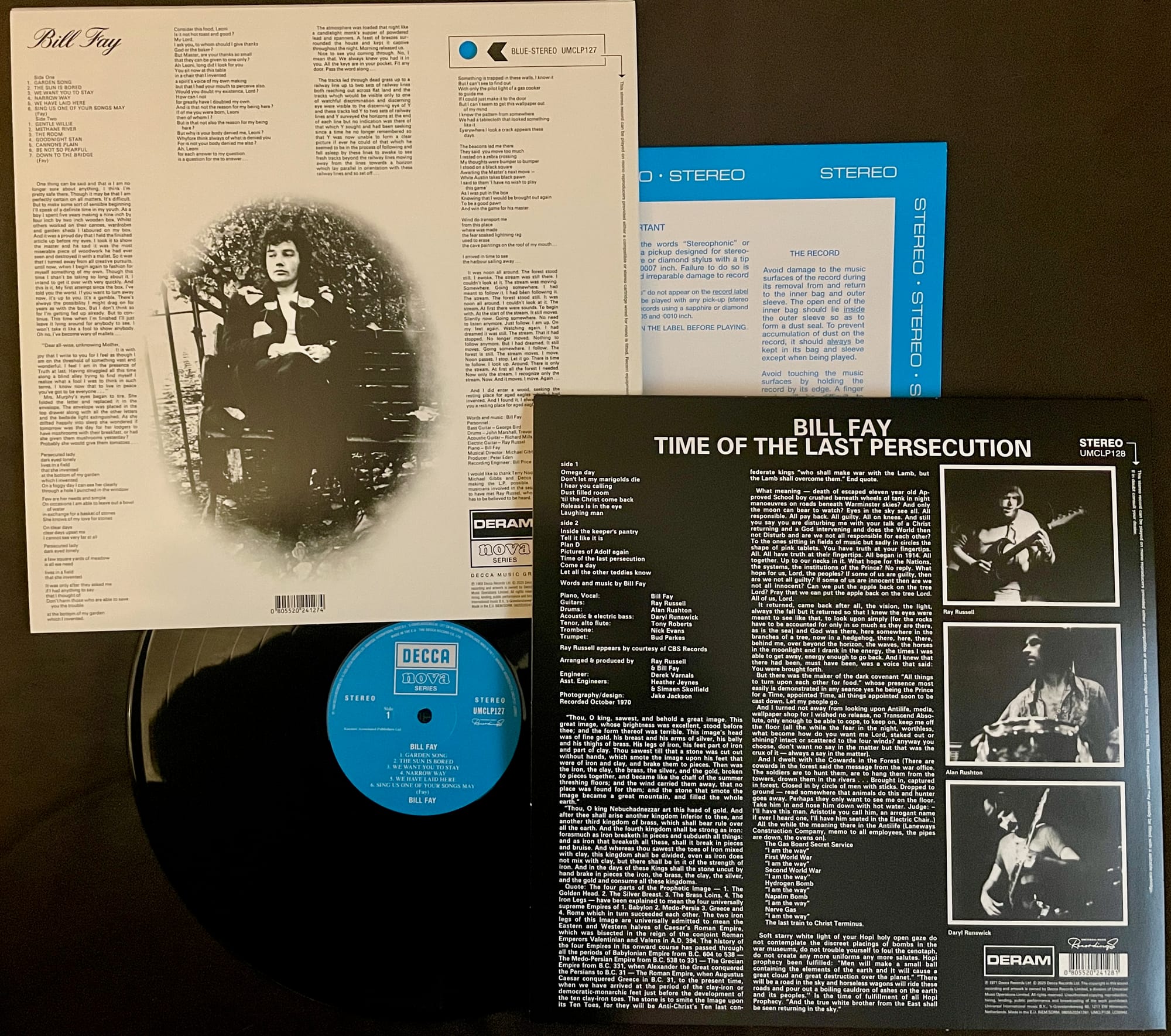 My discs were perfectly flat and centered, but I did see some light scuffs on them, and there were numerous faint clicks and noise in the background during some of the quieter passages on both discs, so the GZ pressings are not flawless. Time of the Last Persecution was the greater offender, with some repeating ticks on Side 1. Considering how expensive original pressings are, it’s a tradeoff I’m happy with—I’d rather be with slightly compromised pressings of these excellent LPs than none at all. But if the presence of any noise on a new disc is a deal-breaker for you, then you may wish to pass these by. The albums come in reproductions of the original jackets, right down to the peephole on the back cover of Bill Fay that reveals the blue border of the inner sleeve, indicating that it is the stereo version of the album. (Bill Fay was also released in mono in 1970, although by that time it’s quite possible that they simply folded down the stereo mix rather than craft a dedicated mono mix. Time of the Last Persecution was only released in stereo.) While reproducing Decca’s inner sleeves of the era, these inners are printed on card and are not die-cut or poly-lined, as opposed to the original Decca inners.